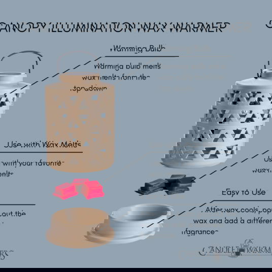 Canopy Illumination Fragrance Warmers quickly and safely warm wax melts from above. A halogen light gives off a soft glow, and ceramic or porcelain finishes provide a pop of color in line with today's home decor trends. Canopy warmers are perfect for adding candlelight ambiance and your favorite home fragrance to any room in the home.